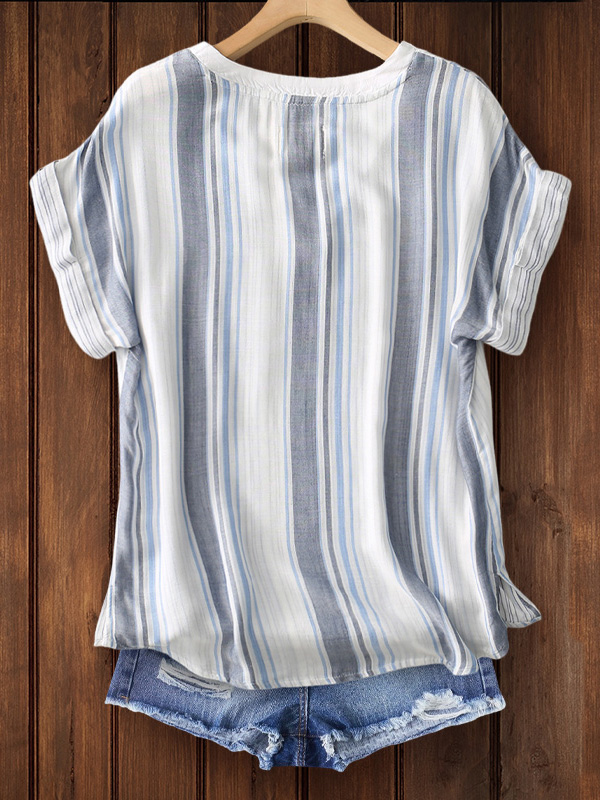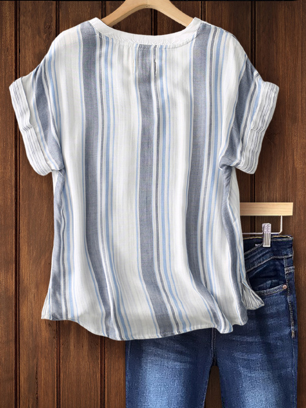 Made from a cotton and linen blend with a soft blue stripe print, this top has a relaxed silhouette and a draped feel, providing superior comfort and breathability to help you stay cool in warmer weather. The V-neck design elongates the neckline, and the rolled sleeve details on the cuffs add a casual and sophisticated feel.