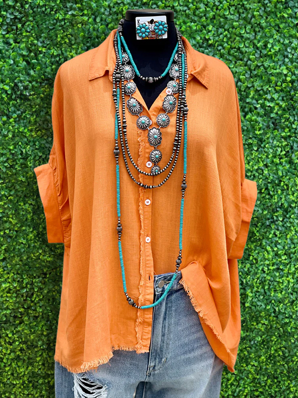 Stay stylish and comfortable with our Linen Button Up Top in vibrant orange. Made with high-quality linen fabric, this top is perfect for any occasion. Pair it with jeans for a casual look or dress it up with a skirt for a more polished ensemble. The button-up design adds a touch of sophistication, while the orange color adds a pop of brightness to your wardrobe. Upgrade your style with our Linen Button Up Top in Orange.