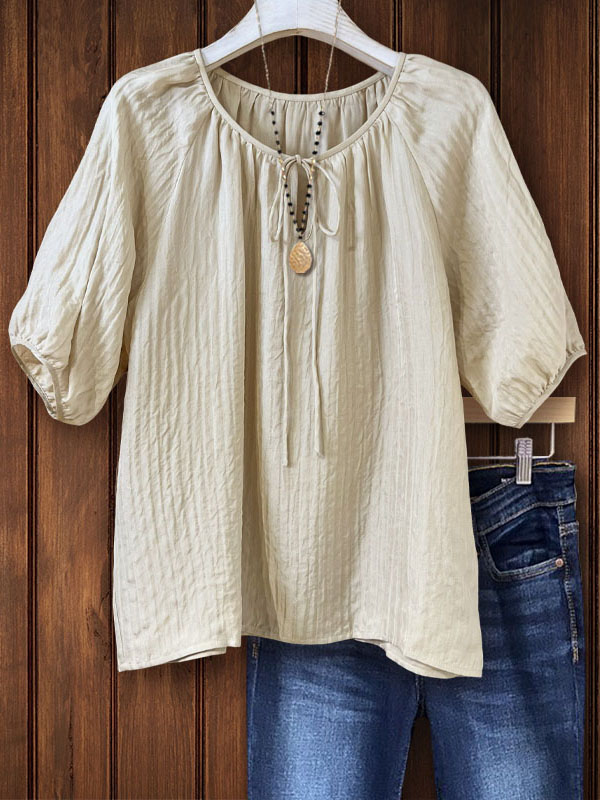 The top's fabric features a pleated striped texture that adds depth and visual interest to the garment. Textured stripes create tactile dimension, enhancing the overall aesthetic and giving the top a unique and sophisticated dimension. Made from a cotton and linen blend, this shirt offers the perfect balance of comfort and durability.