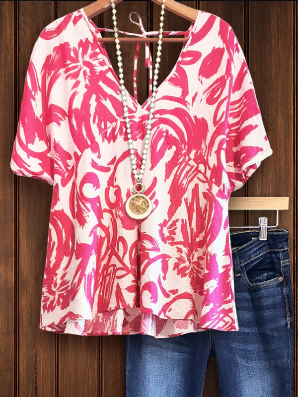 This top exudes charming femininity. The fabric feels soft and comfortable, and the V-neck and lace-up details are perfectly combined. The abstract print design is fashionable and eye-catching. Wear it to welcome the warm summer and go on a date with good friends!