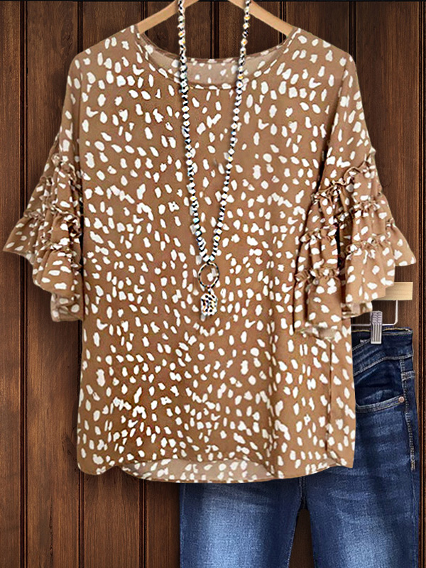 This is a retro yet fashionable animal print shirt with layered patchwork details on the ruffled sleeves, adding a touch of charming femininity. A soft khaki animal print is blended with a light-soft, comfortable cotton blend in a loose fit that's perfect for everyone or any occasion.