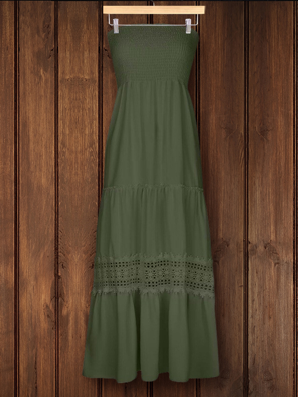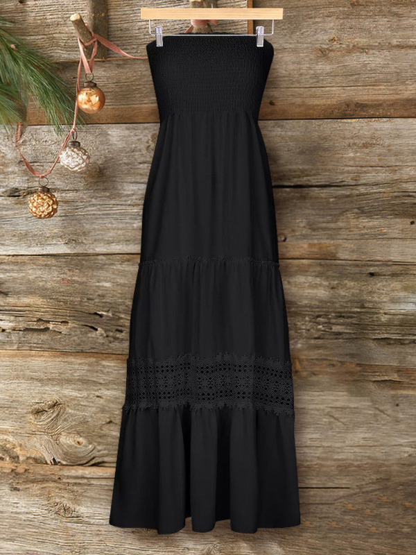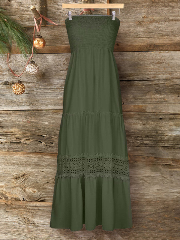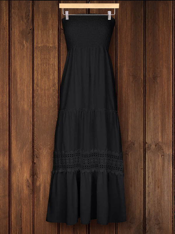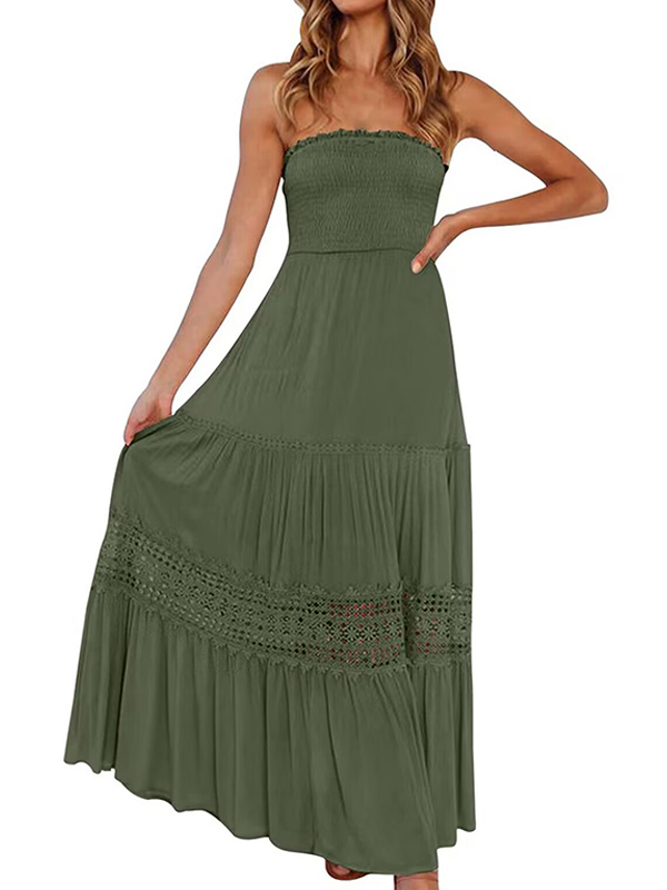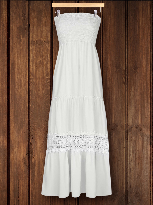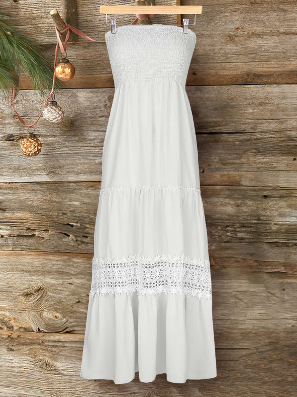Show off your freedom-loving personality in this bandeau print dress. The upper body has parallel pleats, and the hem is paneled with tonal lace for added volume and beauty. Plenty of skirts dance freely in the wind, perfect for summer vacations and beaches.