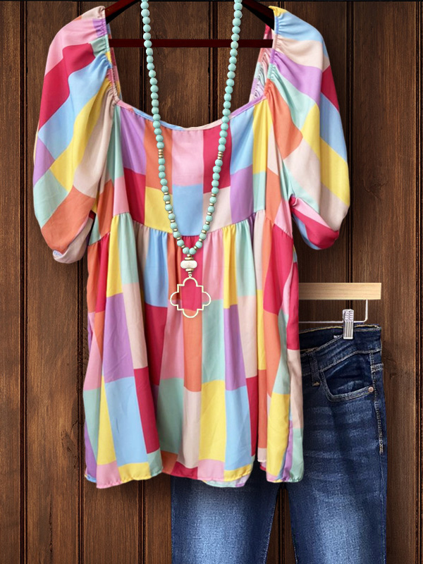 This is a top that perfectly combines sweetness and comfort. The colorful plaid print is vibrant. The sweet puff sleeves and square neck design combine perfectly. The fabric feels drapey and soft. Perfect for a date with good friends.