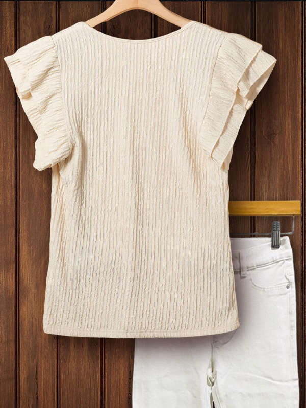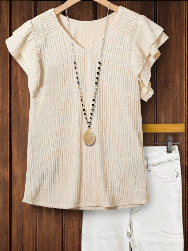 This solid blouse will brighten up your summer wardrobe.Its V-neck, cute flutter sleeves, and breathable fabric are suitable for hot days,The crinkle texture adds a bit of visual interest to your look.Well-matched with pants, a skirt, or shorts for a pretty outfit.