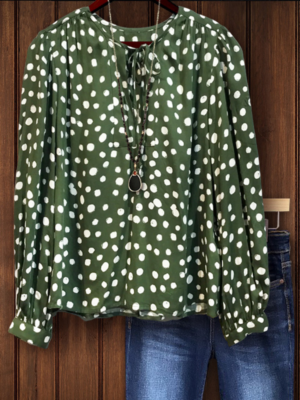 Channel your inner retro queen with this dot print top in a nostalgic green hue. classic dot print adds a touch of wildness and sophistication, while a relaxed fit ensures comfort. Made from high-quality materials, this top is not only stylish but also durable. Wear it with any fitted casual pants.