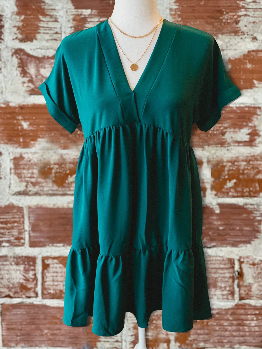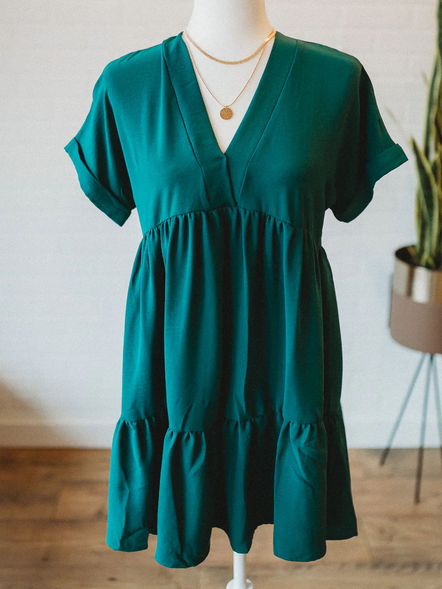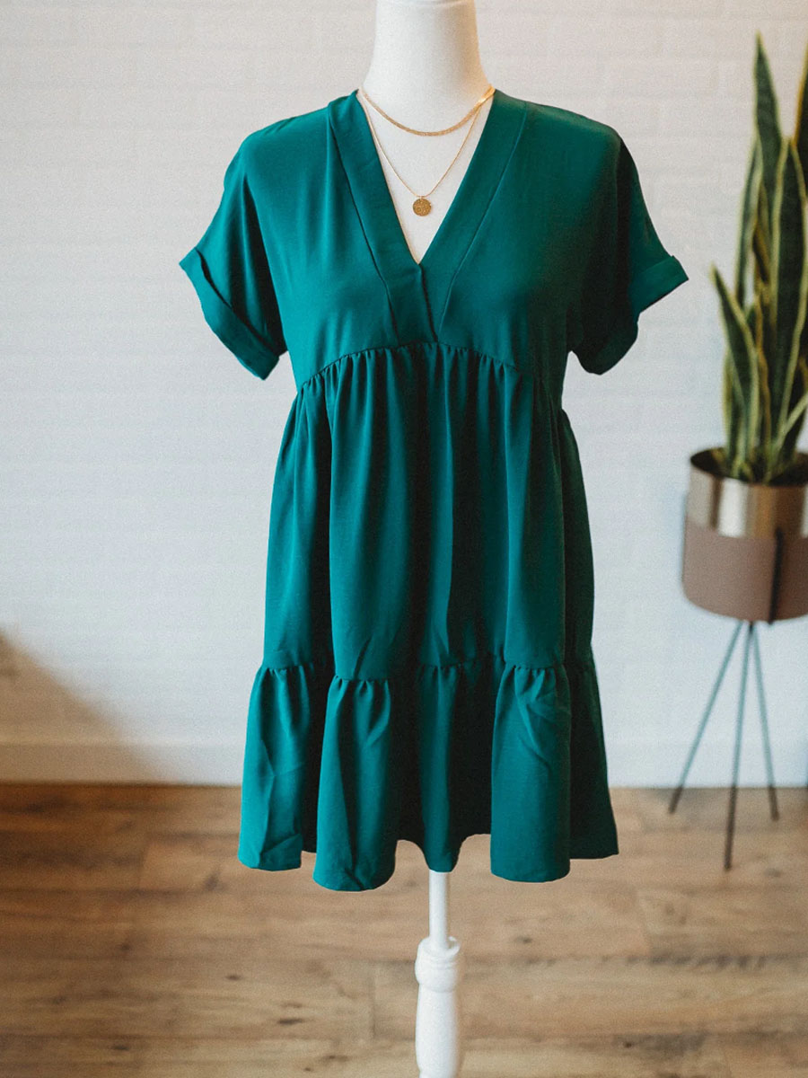 Elevate your everyday style with this Drop Shoulder Green Tiered Dress. The relaxed fit and notched V-neck add a touch of sophistication to this babydoll dress. Perfect for a casual day out or a special occasion.