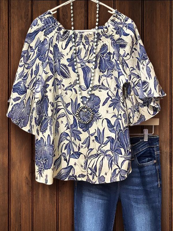 This floral top features a crew neck with stretch pleat detailing, making it easy to create a variety of looks. The chic ruffle sleeves and elegant blue floral print combine to add a touch of elegance, perfect for a day at the office or a weekend brunch.