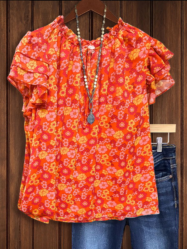 The Floral Tiered Ruffle Sleeve Top is a feminine and romantic garment that boasts a beautiful floral print and cascading tiers of delicate ruffles on the sleeves. The relaxed fit adds a laid-back vibe, while the structured shoulders make a statement. This top is perfect for adding a touch of whimsy to any outfit.