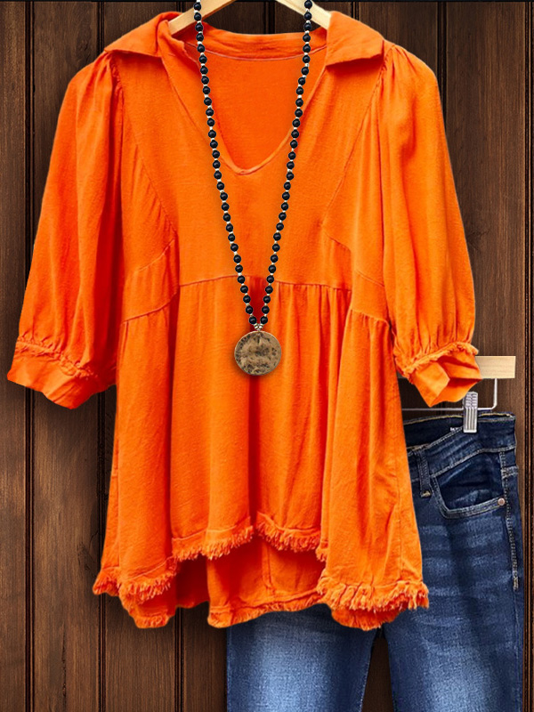 This is a vibrant and fashionable top. The trend is the perfect combination of bright orange tones and loose-fitting puff sleeves. The collar and hem have frayed details. The V-neck design of the shirt contrasts with the baby doll silhouette. I believe this top will look great on anyone wearing it.