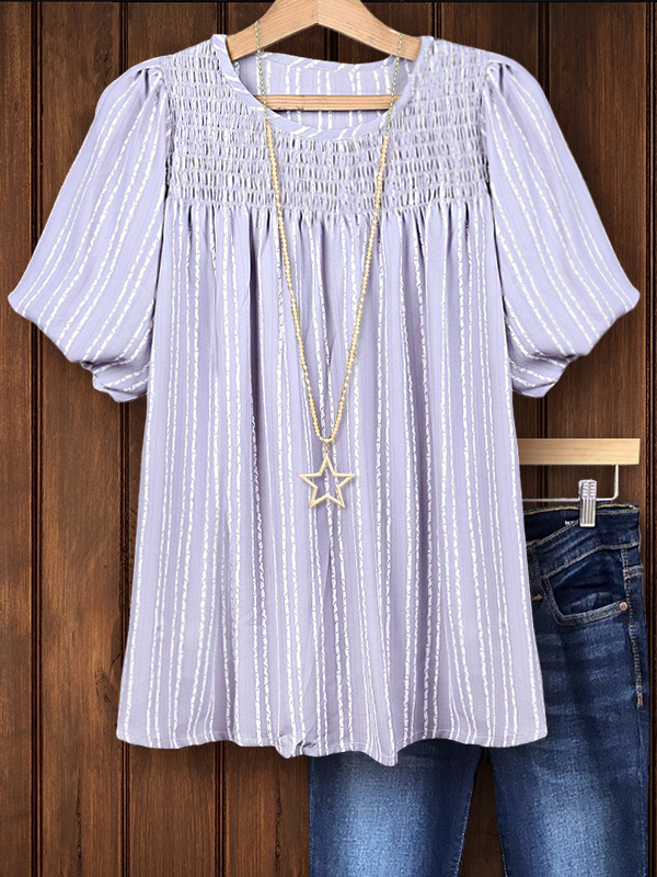 This shirt is made from a soft, breathable cotton blend. The pleated detail on the front and puff sleeves add a touch of chic. The light purple vertical stripe print elongates the proportions, and the loose cut is classic and versatile. I’m sure it will become your new favorite!