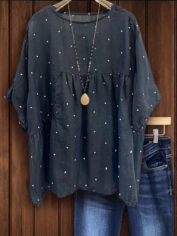 This piece is made from breathable, flowy cotton and linen. Classic black and white polka dot color scheme, irregular splicing design at the hem, dolman sleeves, and loose tailoring, suitable for everyone. I believe it will become your new daily favorite!