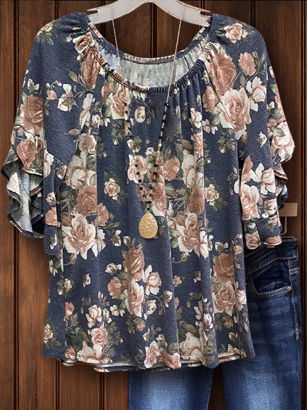 Stay stylish and comfortable in this floral print ruffle sleeve T-shirt with a relaxed fit and feminine ruffle sleeves. The fabric features a soft, next-to-skin knit and an elegant large floral design, perfect for a casual-chic look.