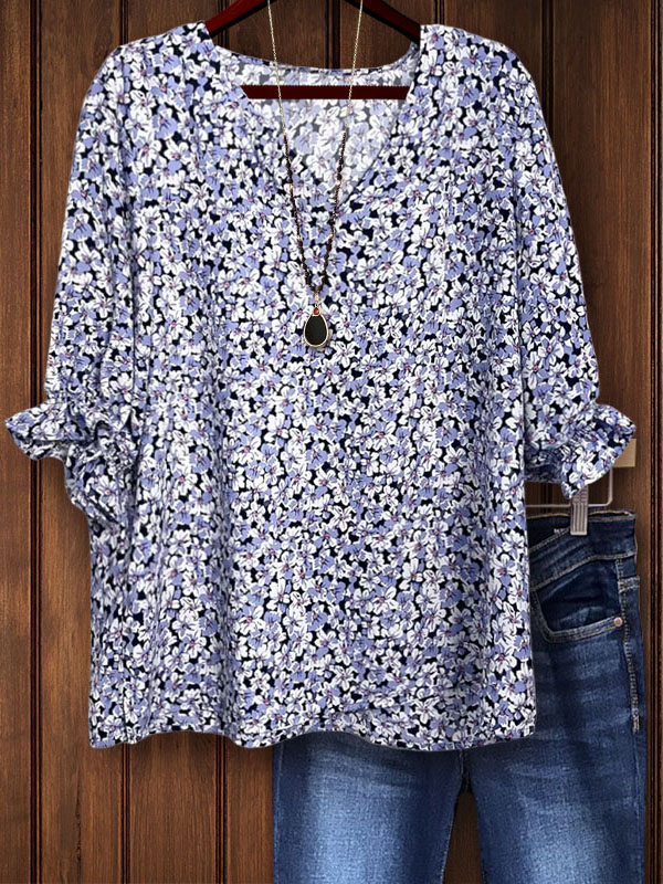 The top is adorned with a floral print showcasing a variety of blossoms in different sizes creating a lively and vibrant pattern. The floral design adds a touch of nature-inspired elegance making the top visually appealing and perfect for a variety of occasions. The sleeves of the top are designed with ruffles adding a layer of texture and movement.