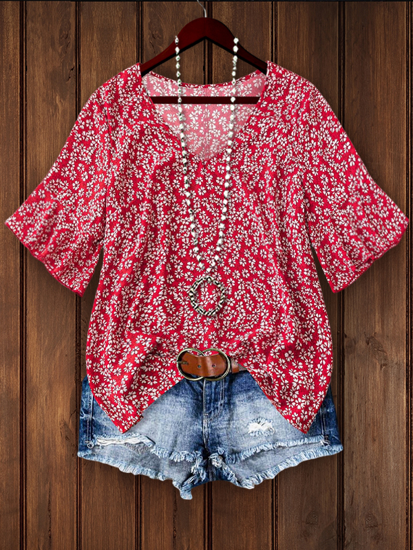Ensure style and comfort in this loose red top with a floral print and ruffled sleeves. The fashionable red floral print is eye-catching, and the fabric has an elegant and soft texture. I believe you will fall in love with it!