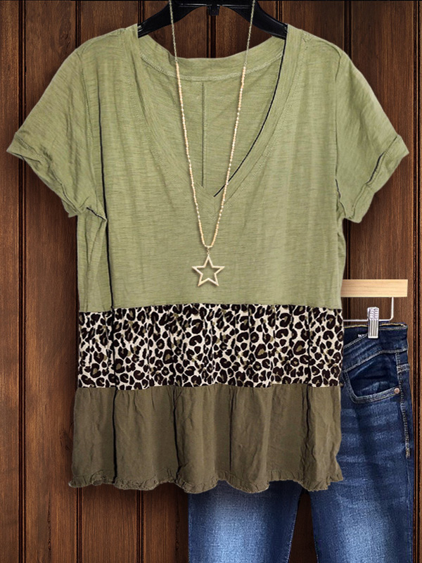 This eclectic patchwork T-shirt is made from a mix of different textured fabrics for a casual yet unique look. The charming green color and V-neck design add a chic casual retro feel. Pair it with your favorite casual jeans for a day-long effort.