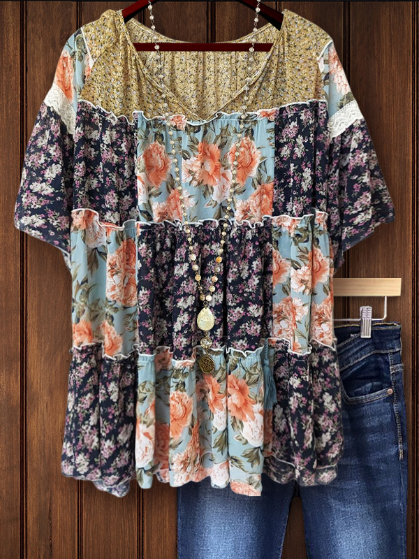 Make a statement in this mixed print layered V-neck top. A bold combination of sweet ruffle details, mixed prints, and layered designs create a unique and eye-catching look, and the fabric drapes freely and is sure to turn heads wherever you go.