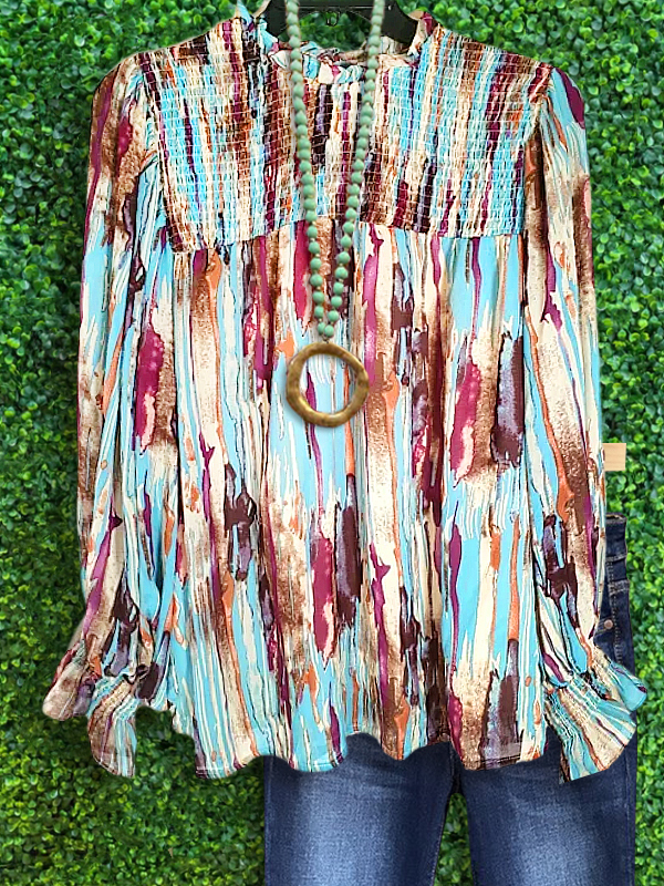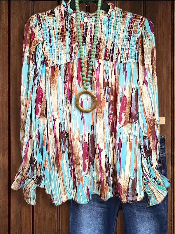 Elevate your style with this stunning blue purple top. Featuring a mock neck and smocked detailing, it effortlessly exudes sophistication and elegance. Pair it with your favorite bottoms for a polished and chic look.