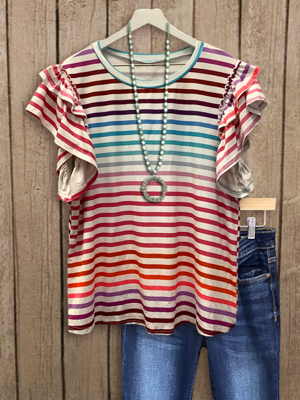 The Multicolored Stripe Print Ruffle Top is a vibrant and playful addition to any wardrobe. Featuring a bold stripe pattern and feminine ruffle detailing, this top is perfect for adding a pop of color to your everyday look.