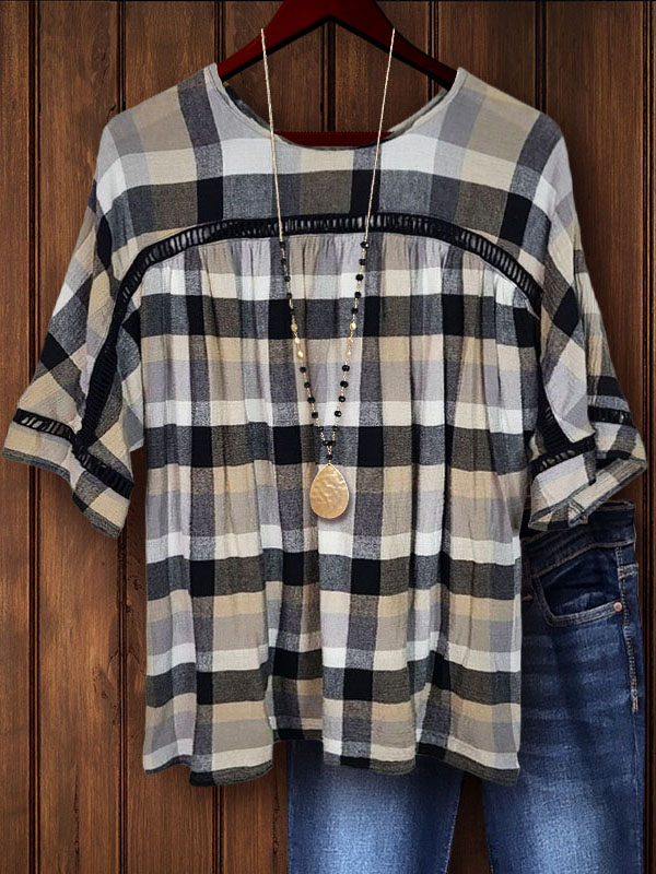 This slouchy top features a mélange plaid pattern and subtle patchwork details. Mid-sleeves and a loose fit enhance overall comfort. Made from breathable cotton and linen, this top is perfect for casual work or on-the-go.