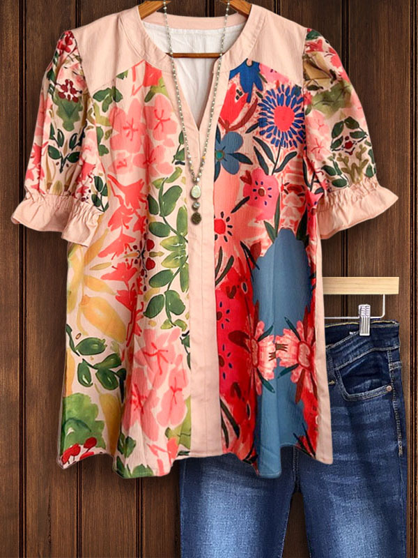 This shirt is crafted from pleated textured fabric, creating a subtle yet sophisticated vibe. Featuring a vibrant floral print, the floral pattern adds a touch of natural beauty and elegance to the garment. The front and back patchwork design visually adds a sense of fashion and uniqueness.