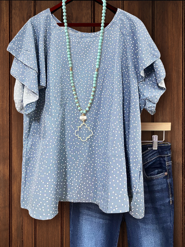 This polka-dot style is made from draped chiffon for a comfortable fit. The blue and white polka dots are classic and eye-catching, with a loose fit and double-layered raglan sleeves. It pairs well with your favorite summer denim shorts or cotton and linen slacks. I believe it will become your new favorite!