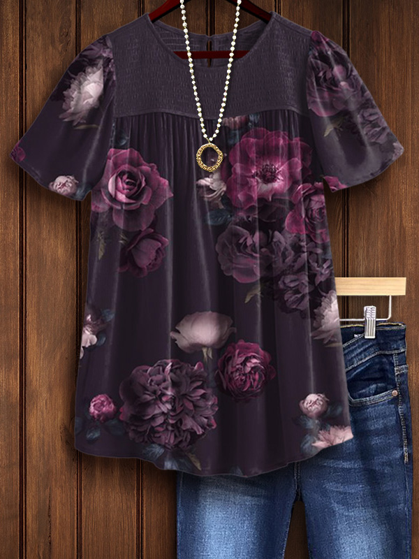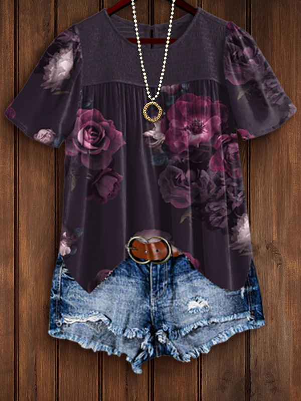 The floral pattern showcases beautifully delicate roses in shades of purple adding a touch of romance and elegance. The smucker detail is a specific type of delicate stitching and embellishment that adds texture and visual interest to the top. It is found around the bodice providing a snug and comfortable fit while adding a decorative element.