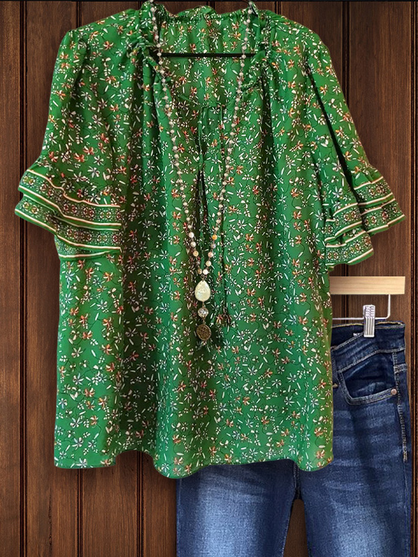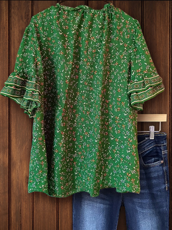 This is a retro yet feminine shirt. The V-neck is decorated with tie details and ruffles, and the double-layer ruffled sleeves add a touch of chic. The emerald green flowers seem to have entered a secret garden. The fit is loose and comfortable, and the fabric drapes softly, making it perfect for any occasion.
