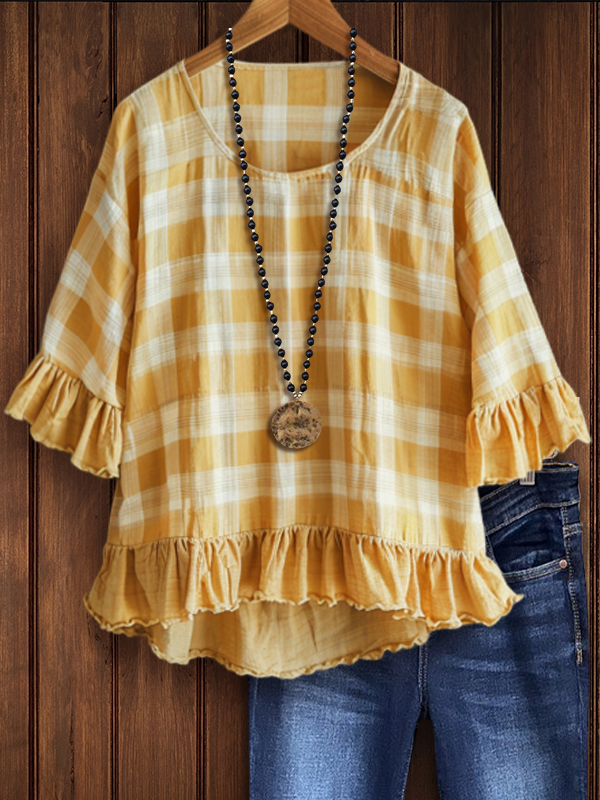 Stay active and stylish in our yellow cotton plaid top. The loose fit, irregular design splicing details at the hem, and wide ruffled sleeves add a touch of fashionable feminine charm. This is the perfect piece to ensure comfort and style.