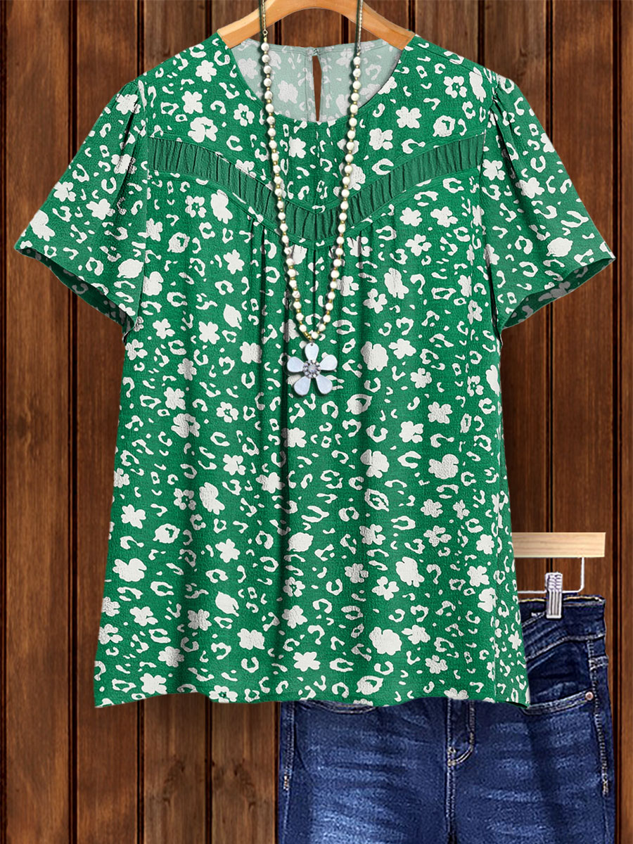 Stay comfortable and stylish in our top.It is made of soft and breathable cotton.The print and ruffle sleeve combination is very classic, and the ruched details add a touch of chic.Pair it with jeans for a casual yet chic look.