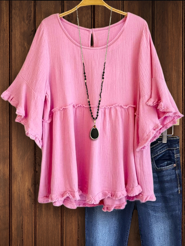 Add a pop of color to your wardrobe with our pink top. Ruffled sleeve details add a feminine touch, and brushed details on the cuffs and hem make this top a must-have for the fashion-forward woman. This is a vibrant and playful choice.