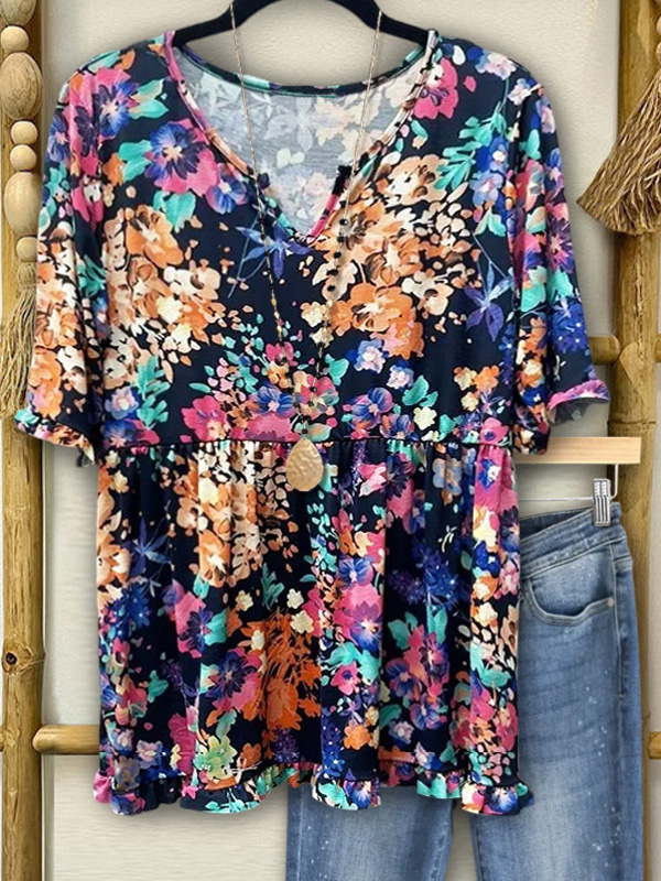 Step into a whimsical and playful world with this top, featuring a Secret Garden-inspired floral print and double ruffle accents. The adorable baby doll silhouette and feminine notched V-neck detail combine to make this T-shirt a charming and delightful choice.