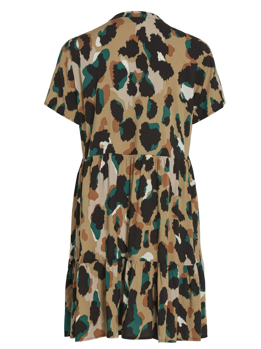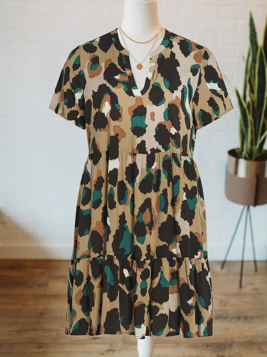The dress in the perfect leopard print color scheme is a fierce and stylish piece that showcases a sleek leopard print with playful layered ruffles. With its bold and striking design, it exudes a sense of confidence and adds a touch of wildness to any wardrobe.