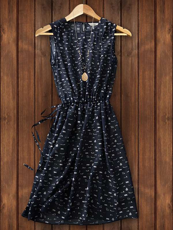 This sweet and playful dress is perfect for you. This cute dress showcases the design of a playful print. The top has a round neckline with a flowing hem and a skirt that falls just above the knee and ties that accentuate the waist. This dress is made from a polyester blend that is both comfortable and cute.