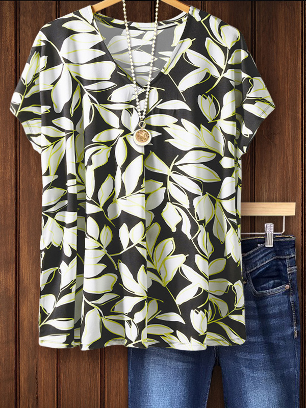 Enrich your top collection! Made from a soft, breathable material, this top features a leaf print, short sleeves and a versatile, retro V-neck detail. Pair with your favorite blue denim shorts or tailored trousers for a casual yet elegant look.