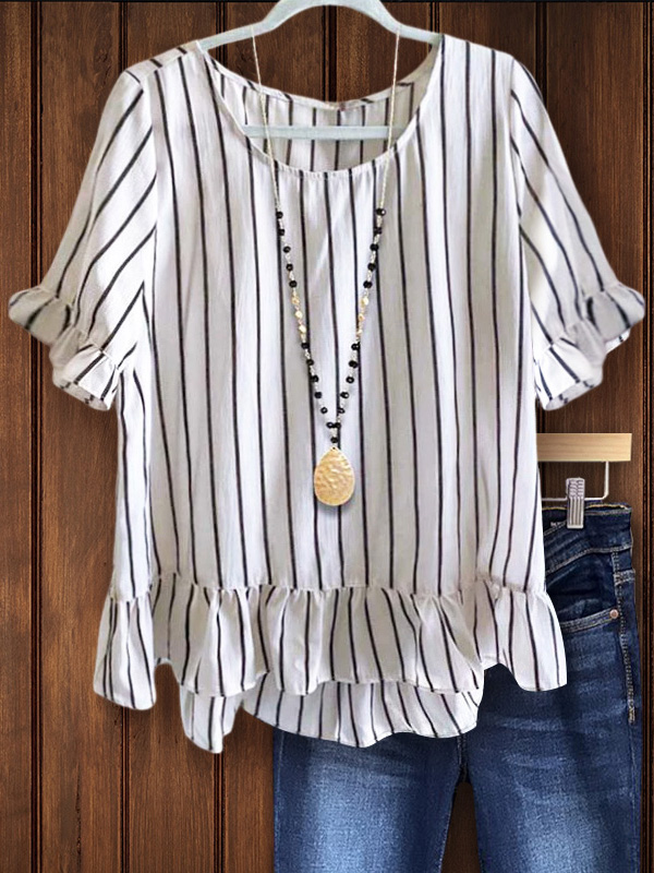 Stay cute and comfy in our striped ruffle baby doll blouse. Featuring a classic striped pattern and a playful ruffled hem for a flattering babydoll silhouette. The soft fabric and loose fit make it perfect for casual wear. Pair with skinny jeans or denim shorts for a sweet and stylish everyday look.