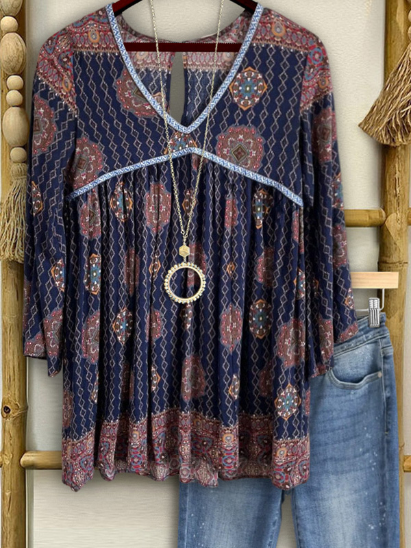 This tribal print top is detailed with subtle blue ethnic webbing panels, adding a touch of chic detail. The ruched babydoll silhouette and flowy cotton-blend fabric are perfect for adding a casual, vintage feel to your look.