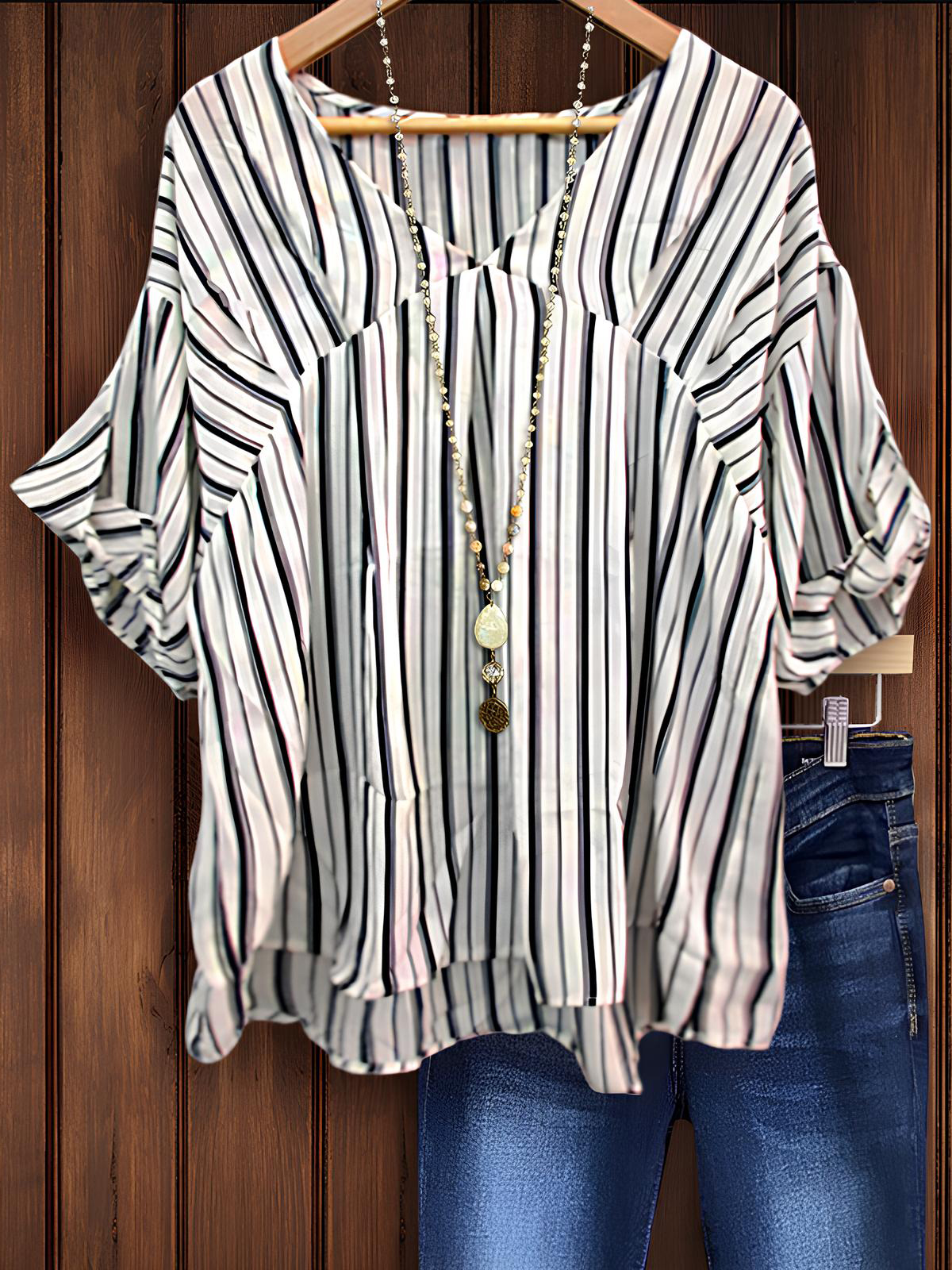 Our V-neck top stays on trend with classic vertical stripes, mid-sleeve roll-up detailing, and a V-neck for a casual yet feminine look. The relaxed fit of this top ensures comfort and is perfect for any casual occasion.
