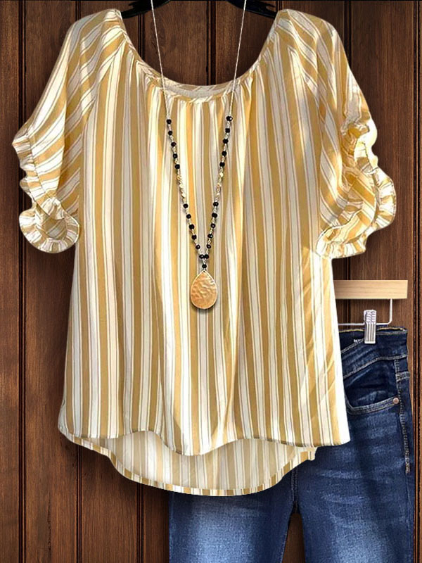 This top combines a bright yellow vertical stripe print with light and soft cotton blend fabric, with ruffle details on the cuffs. The casual silhouette and versatile and simple design make it a must-have for any classic fashion match, every day. Effortlessly eye-catching.