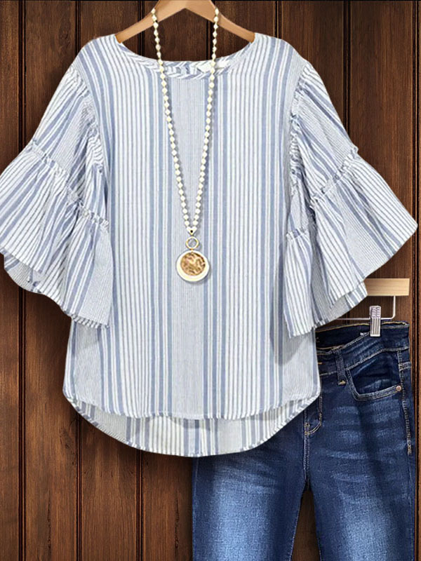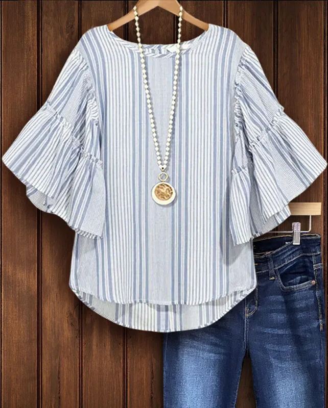 Add a pop of color to your wardrobe with our vertical striped top in a soft blue hue. The wide ruffled sleeve design creates a unique and exaggerated appearance. It can be matched with any style to highlight the fashionable style. The soft-touch cotton fabric keeps you comfortable all day long.