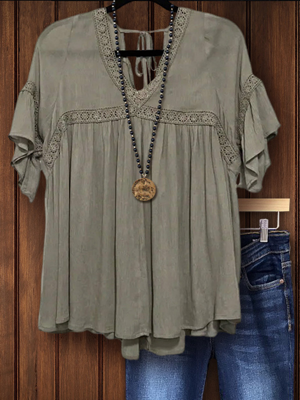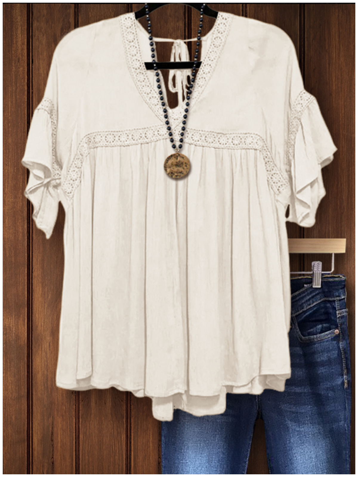 Made of soft and breathable cotton blend, the webbing and lace-up details are full of texture, and the lotus leaf sleeves show a playful feminine touch. The casual atmosphere can be paired with your favorite denim shorts in the summer, I believe it will become your new favorite!